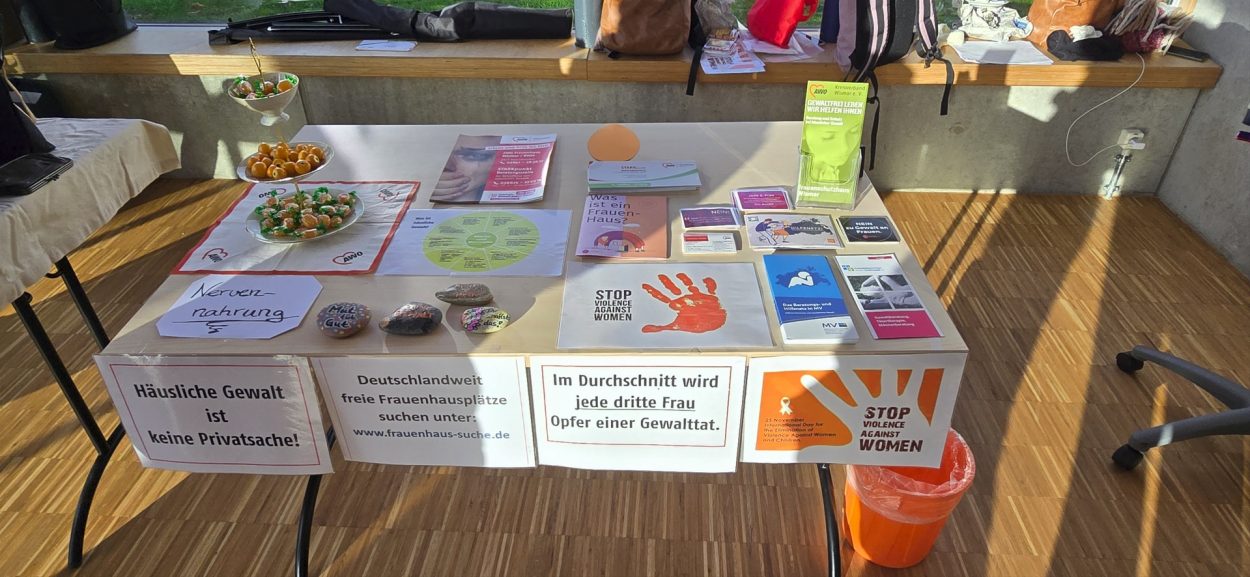 Nach der Theatervorstellung standen die Mitarbeiterinnen der Frauenhäuser und Beratungsstellen für Fragen zur Verfügung. Es war schön, dass auch die anwesenden Schüler*innen sich sehr interessiert zeigten, und sowohl mit Mitarbeiterinnen des Hilfenetzes als auch mit den Schauspieler*innen in Austausch kamen.