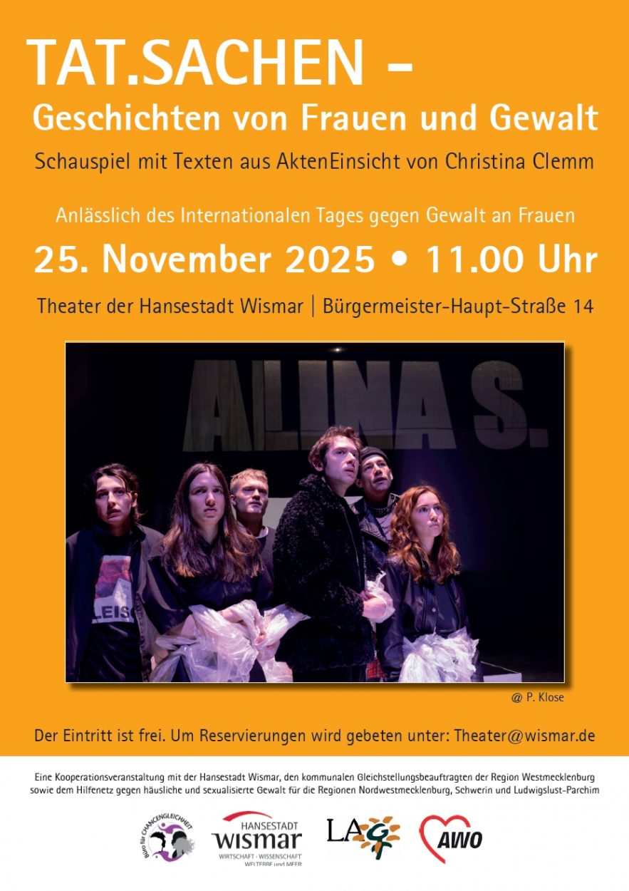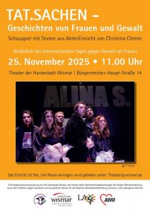 Am 25.11.2025 fand im Rahmen der diesjährigen Anti-Gewalt-Woche eine Aufführung des Theaterstücks „TAT.SACHEN – Geschichten von Frauen und Gewalt“ im Theater Wismar satt, aufgeführt von ehemaligen Schauspielstudenten des Schweriner Theaters.