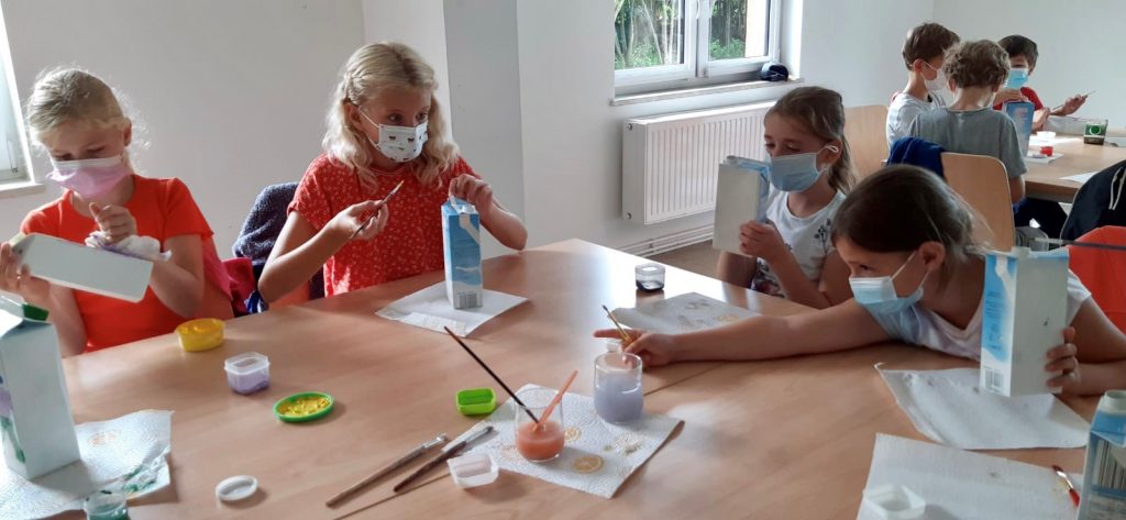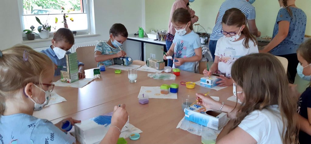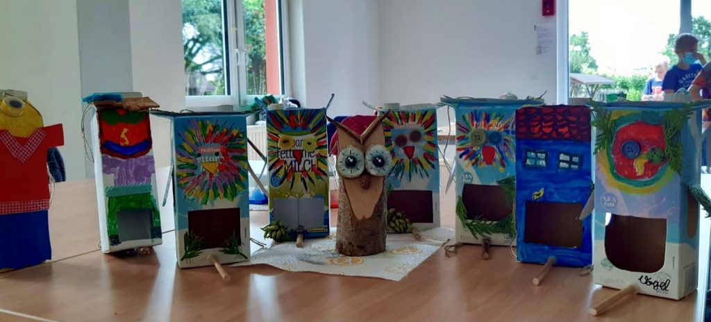 Die 3. und 4. Klasse erlebte derweil lehrreiche und spannende, naturkundliche Tage im Ökologischen Schulort Wismar (ÖSW). Nach einem gemeinschaftlichen Frühstück im Freien widmeten sich die Kinder, das ÖSW-Team um Leiterin, Frau Dabels sowie die Lehrerinnen jeden Tag einem inhaltlichen Schwerpunkt. Beim Thema „Upcycling“ wurden aus alten Milch- und Saftkartons Vogelfutterhäuschen gestaltet. Dabei konnte der Kreativität freier Lauf gelassen werden – es wurde geklebt, gemalt, geschnitten und mit natürlichen Rohstoffen gearbeitet, so dass jedes Kind am Ende ein individuelles und farbenfrohes Vogelfutterhäuschen mit nach Hause nehmen konnte.