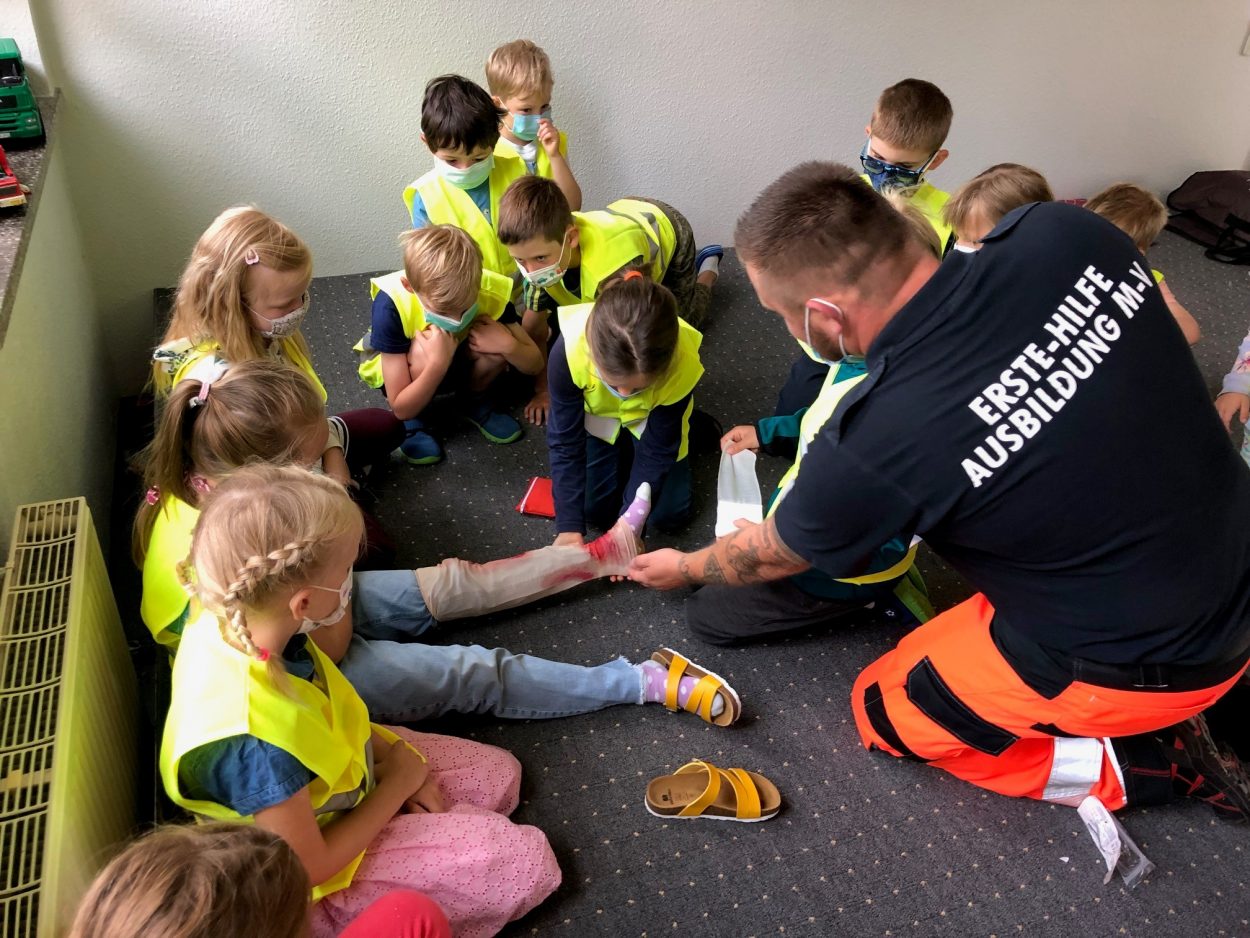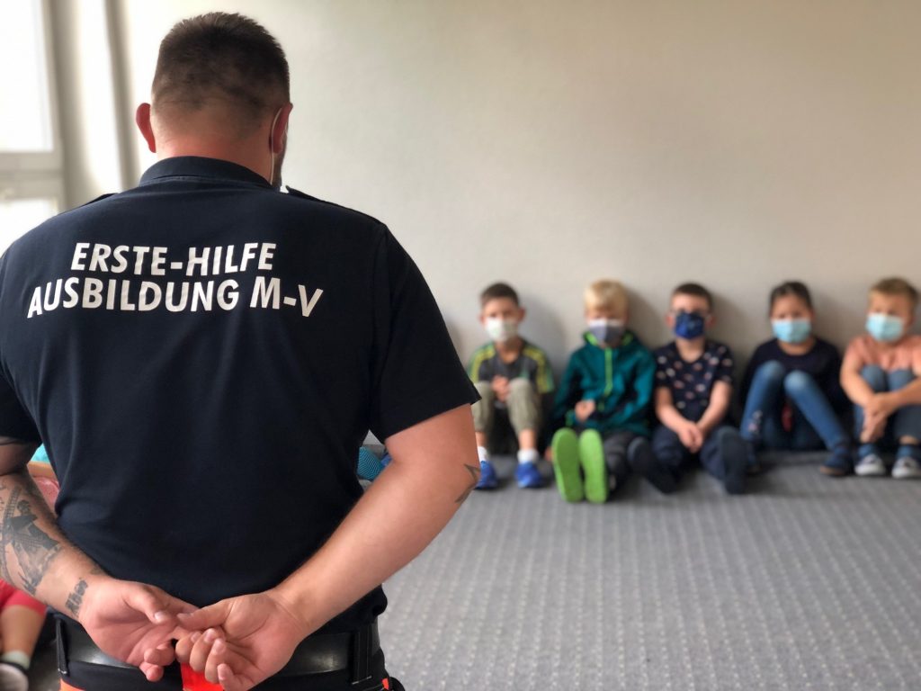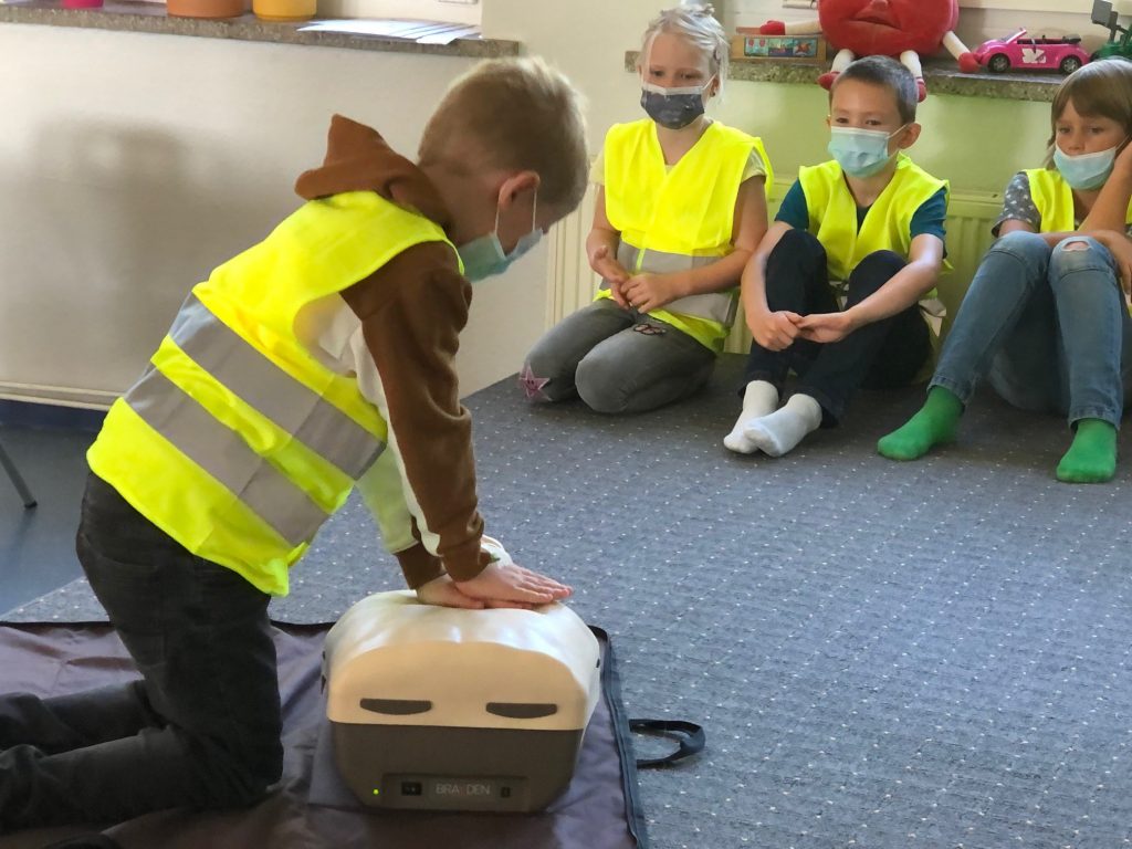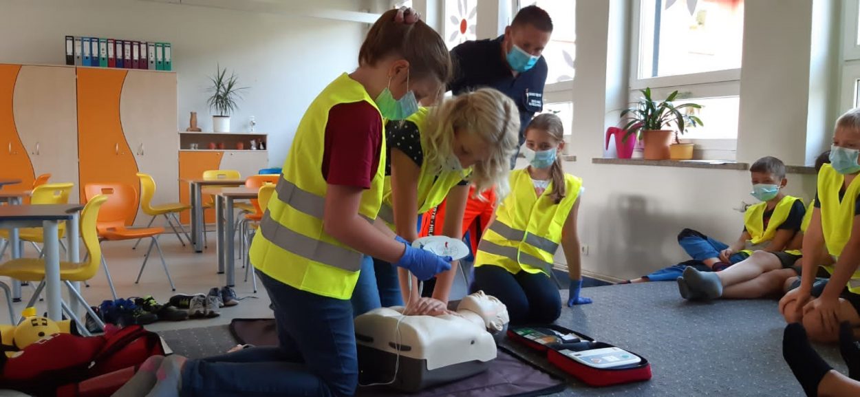 Am Mittwoch absolvierten alle Schülerinnen und Schüler die Küstensanitäterausbildung. Auf kindgerechte Weise wurden sie an das Thema 1. Hilfe herangeführt und hatten viel Spaß dabei. Sie lernten Verbände anzulegen, übten die stabile Seitenlage und probten die Herzdruckmassage. Die 4. Klasse durfte auch den Defibrillator ausprobieren, was sie mit Begeisterung ausführten. Zum Schluss meinten alle Kinder, dass sie nun Ihre Lehrer retten würden, wenn es ihnen schlecht ginge. Vielen Dank an Ausbilder, Herrn Tretow.
