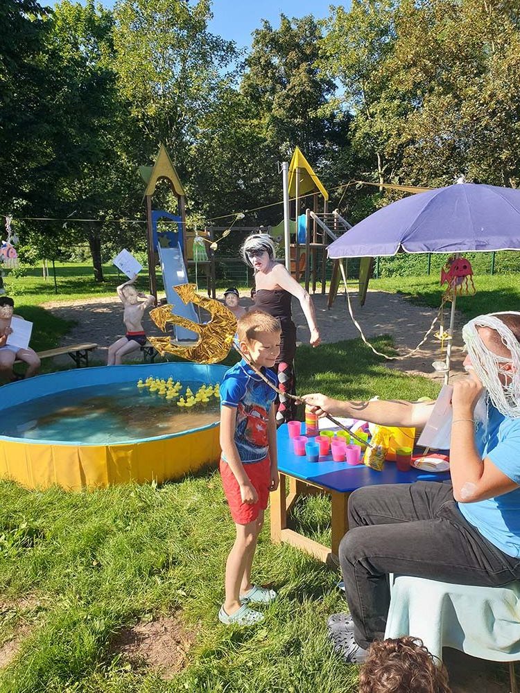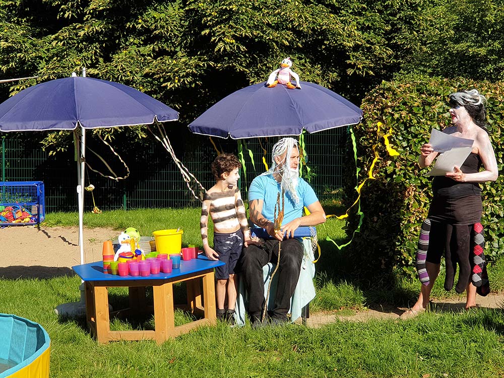 Den letzten Tag der Sommerferien ließen die Hortkinder mit einem Neptunfest ausklingen. Die Kinder wurden von den Helferlein „Diddeldum“ und „Diddeldei“ gefangen um dann von Neptun und Ursula der Meerhexe auf ihren „neuen“ Namen getauft zu werden. Zum Abschluss musste auch die Meerhexe in Wasser steigen.