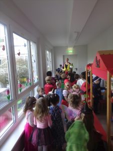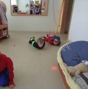 Mit einem Buffett in jeder Gruppe startete der Tag, es wurde viel geschlemmt und auch etwas genascht. Danach gab es einen großen Faschingsumzug, alle Kindergartenkinder kamen zusammen und machten mit lauter Musik und Gesang das Gebäude unsicher. Im Sportraum gab es ein Zwischenstopp zum ausgiebigen tanzen. Wir besuchten die Krippenkinder und es gab ein Erinnerungsfotos mit allen Kindern der Kita.