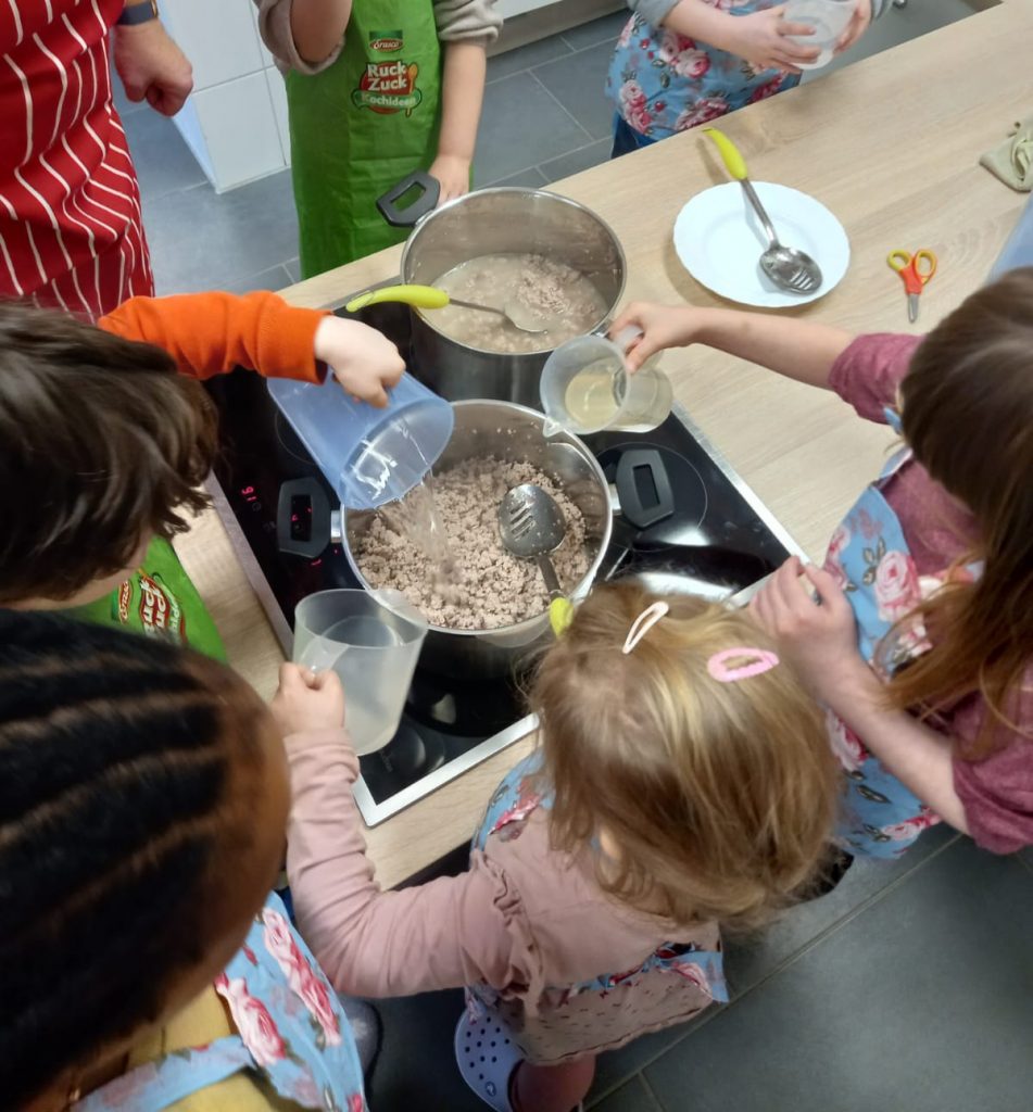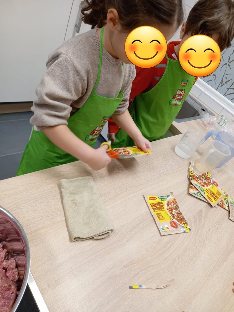 Dort wurde eine leckere Bolognese zubereitet, dazu gab es Spaghetti. Mit viel Engagement waren die kleinen Köche und Köchinnen dabei und halfen bei den verschiedenen Schritten in der Küche.