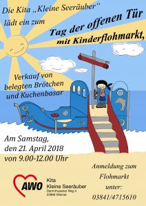 Die Kita „Kleine Seeräuber“ an der Dammhusener Weg 4 lädt zum alljährlichen Tag der offenen Tür am 21. April 2018 in der Zeit von 9.00 bis 12.00 Uhr ein. Auch in diesem Jahr finden parallel ein Kinderflohmarkt sowie ein Kuchenbasar statt. Neu in diesem Jahr ist der Verkauf von belegten Brötchen sowie bei trockenem Wetter Spaß für die Kleinen auf der Hüpfburg. Wir freuen uns darauf, viele Interessierte an diesem Tag zu begrüßen.