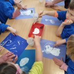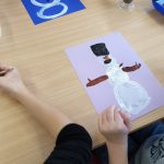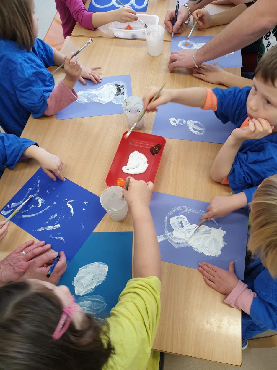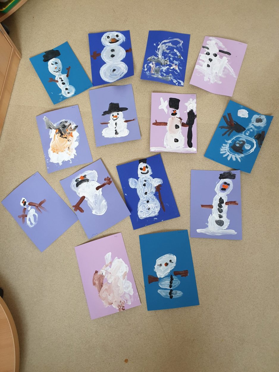 Auch beim Aufwärmen in den Räumen ließ das Thema Schnee die Kinder nicht mehr los, es entstanden viele besondere Schneemänner – mit Pinsel und Farbe gemalt.