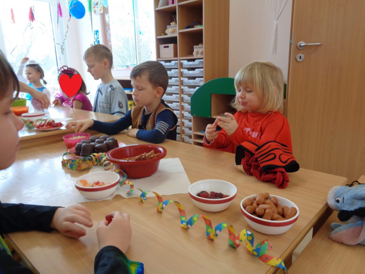 Ein weiterer Höhepunkt war das Faschingsfest, welches trotz einzuhaltender Hygienemaßnahmen ein großer Spaß war. Die Kinder begannen mit einem gemeinsamen Frühstück und gestalteten den Tag unter anderem mit Tanzen, Stuhltanz und Topfschlagen. Zwischendurch wurde natürlich auch noch genascht. 😉