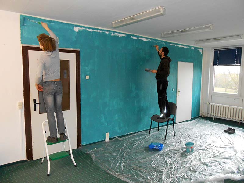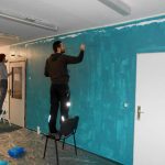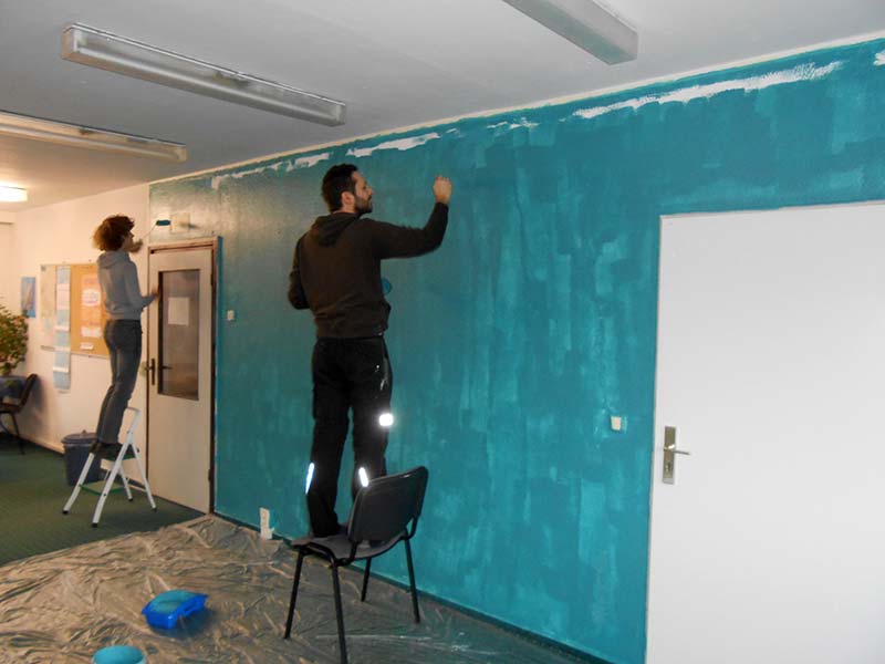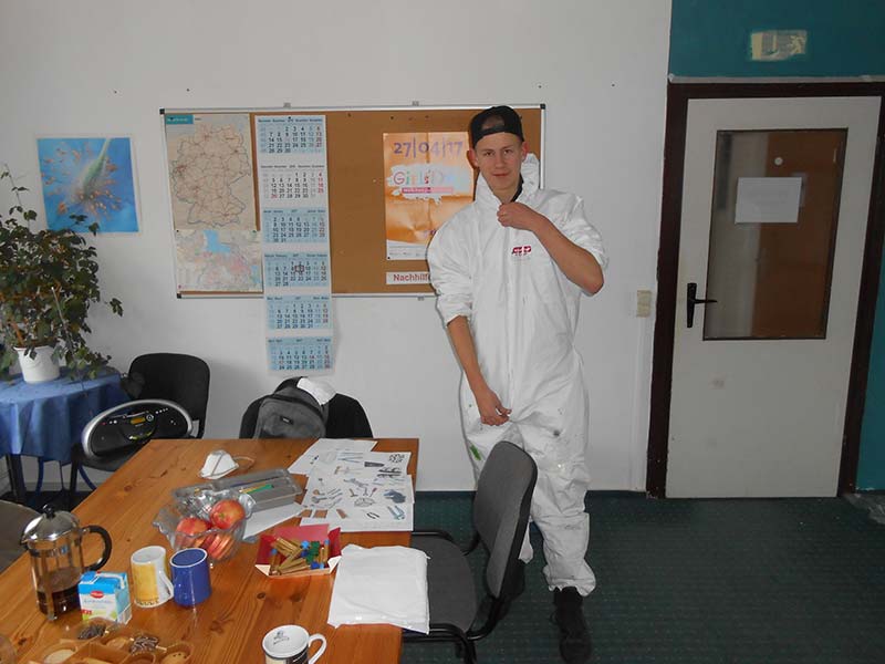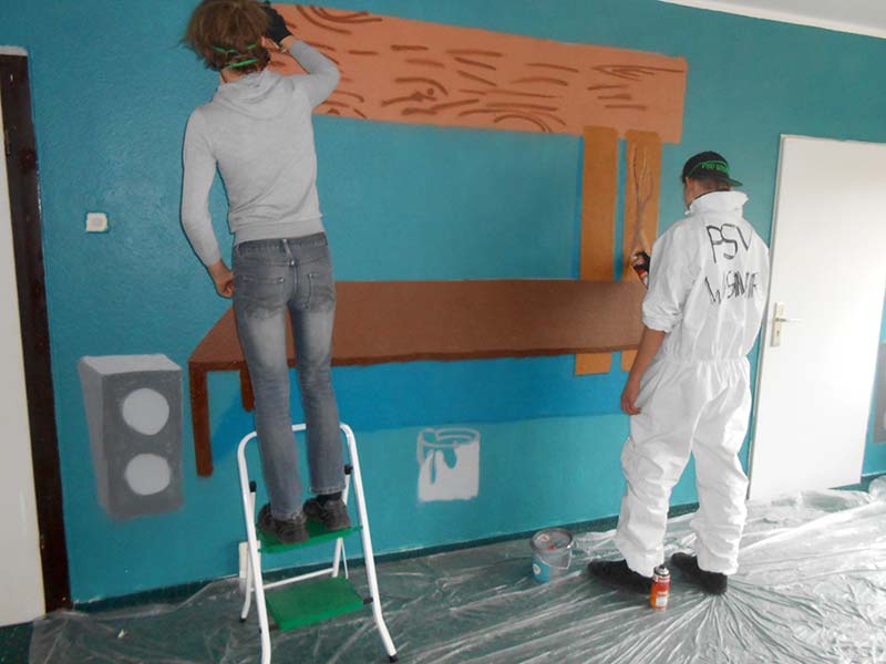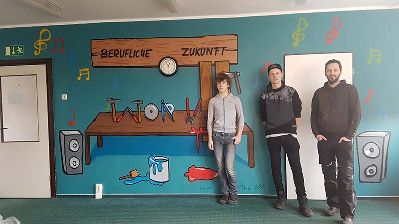 Drei Schüler der 9. Klasse der „IGS Johann Wolfgang von Goethe“ beteiligten sich mit großem Interesse und Engagement in den Ferien an einem Graffiti-Workshop, der über das Projekt „Opti“ organisiert wurde. Am ersten Tag wurde unter Anleitung von Christian Pursch eifrig skizziert und geplant. An den beiden folgenden Tagen setzten Aron und Florian ihre kreativen Ideen mit Begeisterung um und erwarben einige neue Fähigkeiten dazu. Am Ende entstand eine phantasievolle Wandgestaltung. Der Raum soll zukünftig als Werkstatt für das Potenzial-Assessment-Verfahren genutzt werden und dient somit der beruflichen Orientierung.