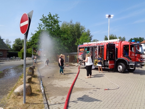 15 Uhr war es soweit, das Fest konnte beginnen und ein weiteres Highlight kam mit Martinshorn und Sirene vorgefahren. Die FF Wismar Friedenshof ist unserer Einladung gefolgt und hat den Kindern bei dem warmen Wetter eine kleine Abkühlung geboten, sowie das Fahrzeug gezeigt und alle Fragen, die aufkamen beantwortet.