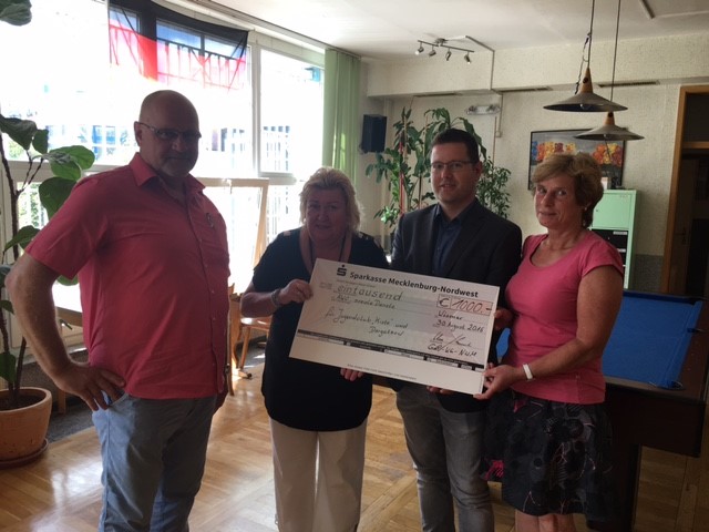 Dieser Scheck wurde am 29.08.2016 von Herrn Burmeister (1. Vorsitzender des Vorstandes der Kreisgruppe Nordwestmecklenburg) an die Jugendsozialarbeiterinnen Liane Hempel (Bürgerhaus Dargetzow) und Kersten Holm (Jugendclub Kiste) überreicht. Das Geld wird in die Kinder- und Jugendarbeit fließen und die Umsetzung neuer Projektidee ermöglichen.